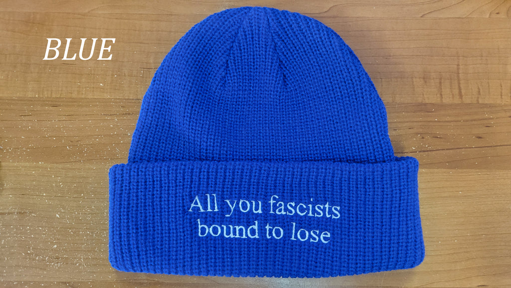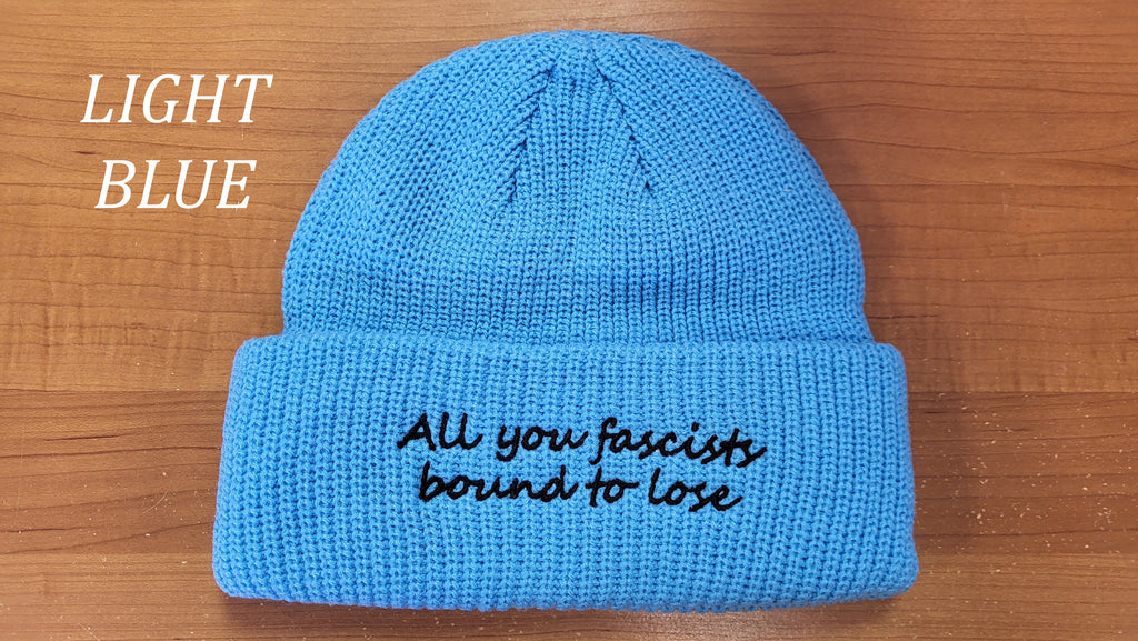 - Hat of your choice; "All you fascists bound to lose" in light blue or royal blue or "This land was made for you and me" in green